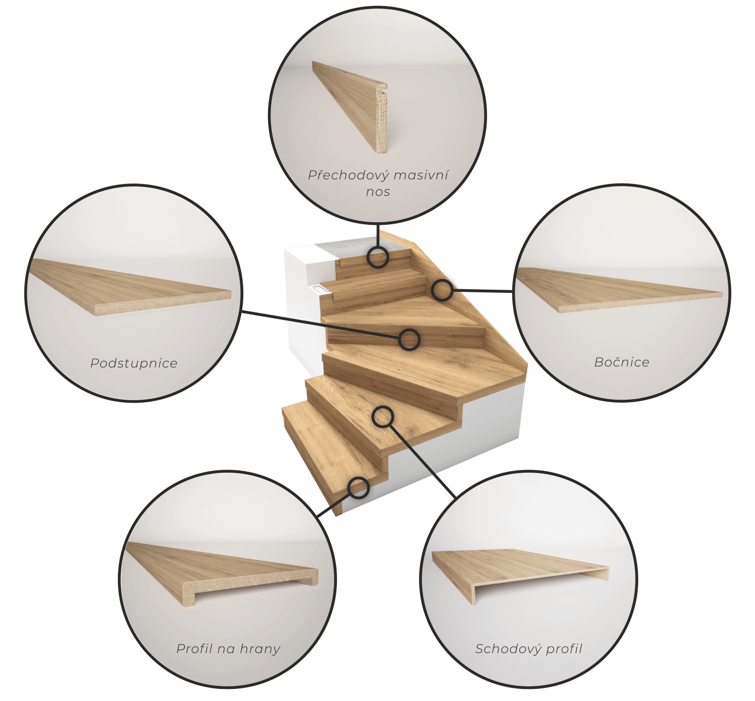 Při výrobě schodů DEQIN kombinujeme několik typů materiálů tak, abychom docílili výborných užitných vlastností a zároveň zachovali přírodní vzhled dubové dýhy.